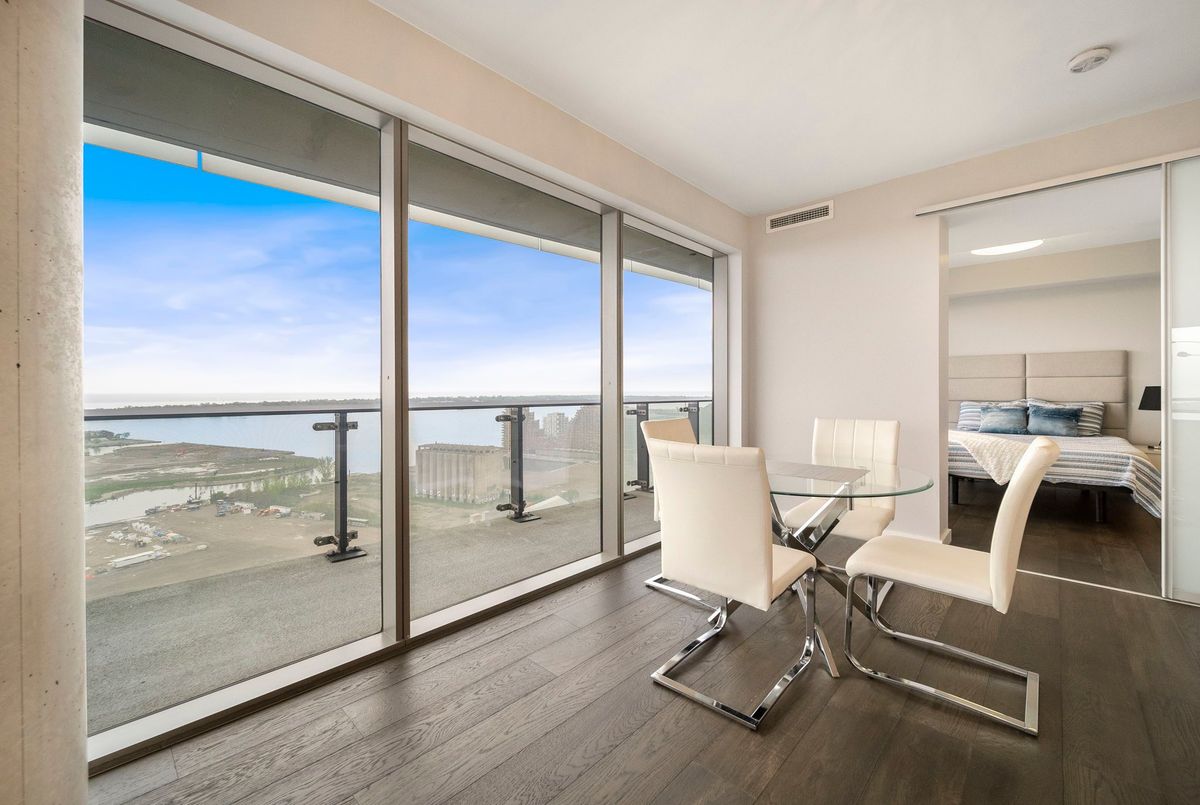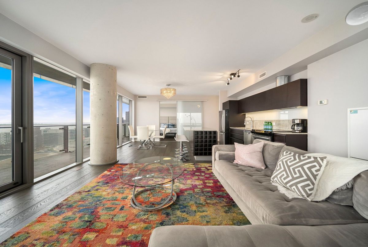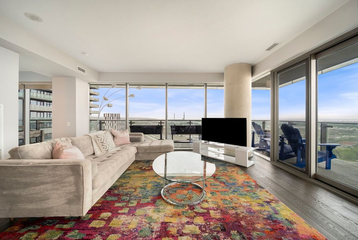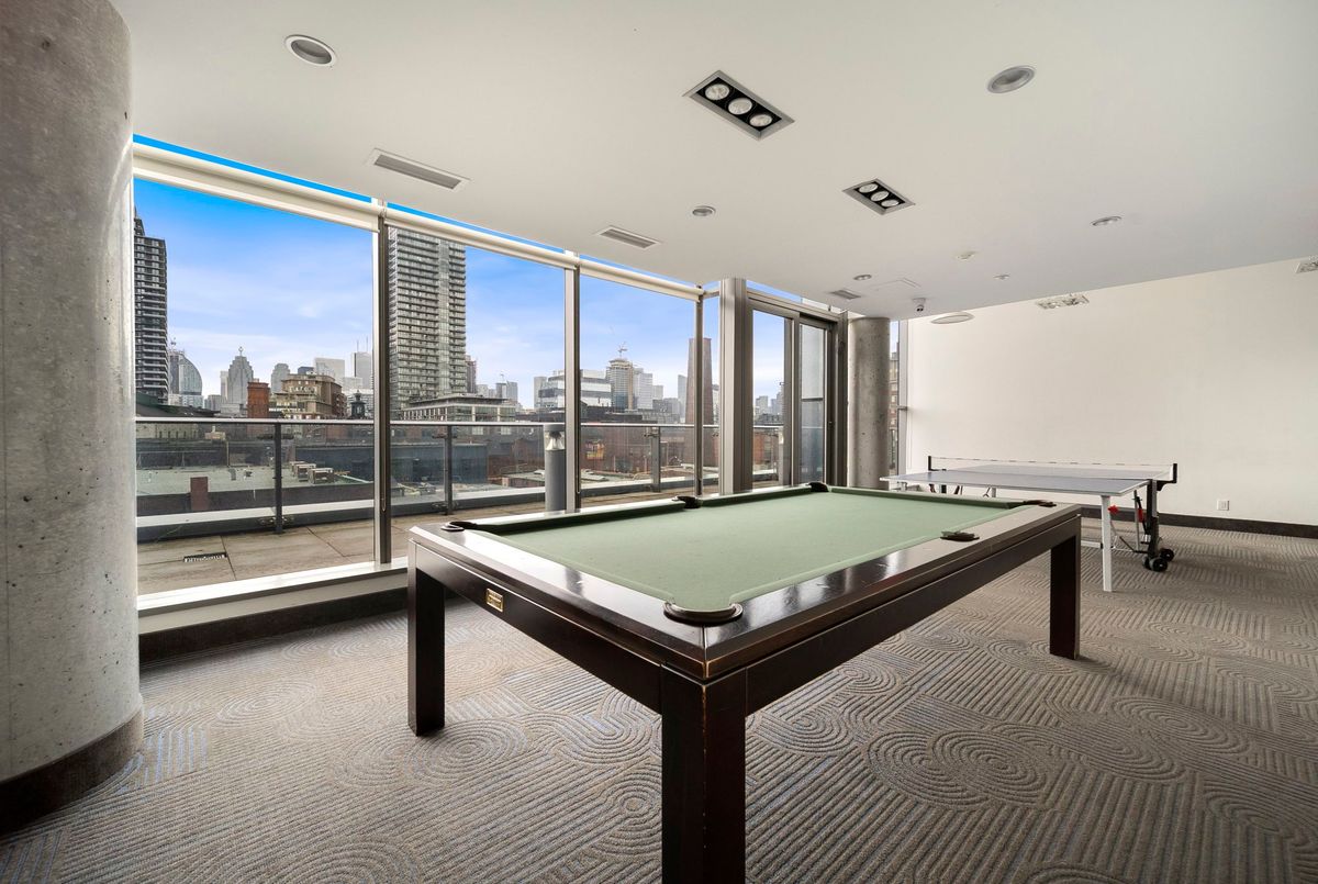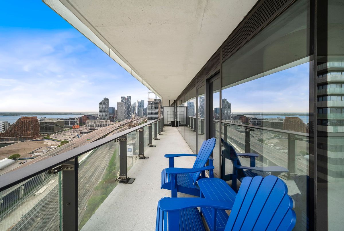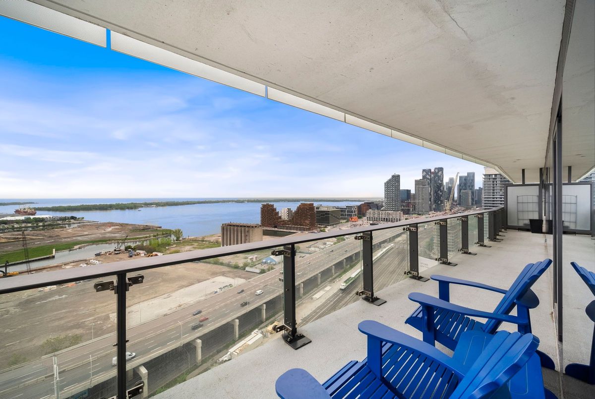 Stunning 2 Bed, 2 Bath furnished corner unit with breathtaking Lake & City views offering luxury living in the heart of the iconic Distillery District! This bright and spacious suite offers gorgeous unobstructed views of Lake Ontario, the city skyline, parks, and beaches all from your approx. 375 sq. ft. wraparound balcony! Thoughtfully designed with a split bedroom layout, this home features a primary bedroom with a walk-in closet and a luxurious 5 piece ensuite bath. The second bedroom includes a built-in Murphy bed, perfect for guests or maximizing your work-from-home space. The modern open concept kitchen is anchored by a custom island, and the suite includes full sized in-suite laundry, parking spot with EV Charger, and a separate storage locker! Building amenities are seemingly endless consisting of a rooftop terrace with a BBQ area, outdoor pool, party room, yoga area + exercise room, sauna, steam room, 24-hour concierge and more! Just steps to the Distillery Districts vibrant shops, dining, and events, with easy access to transit, trails, and the waterfront!