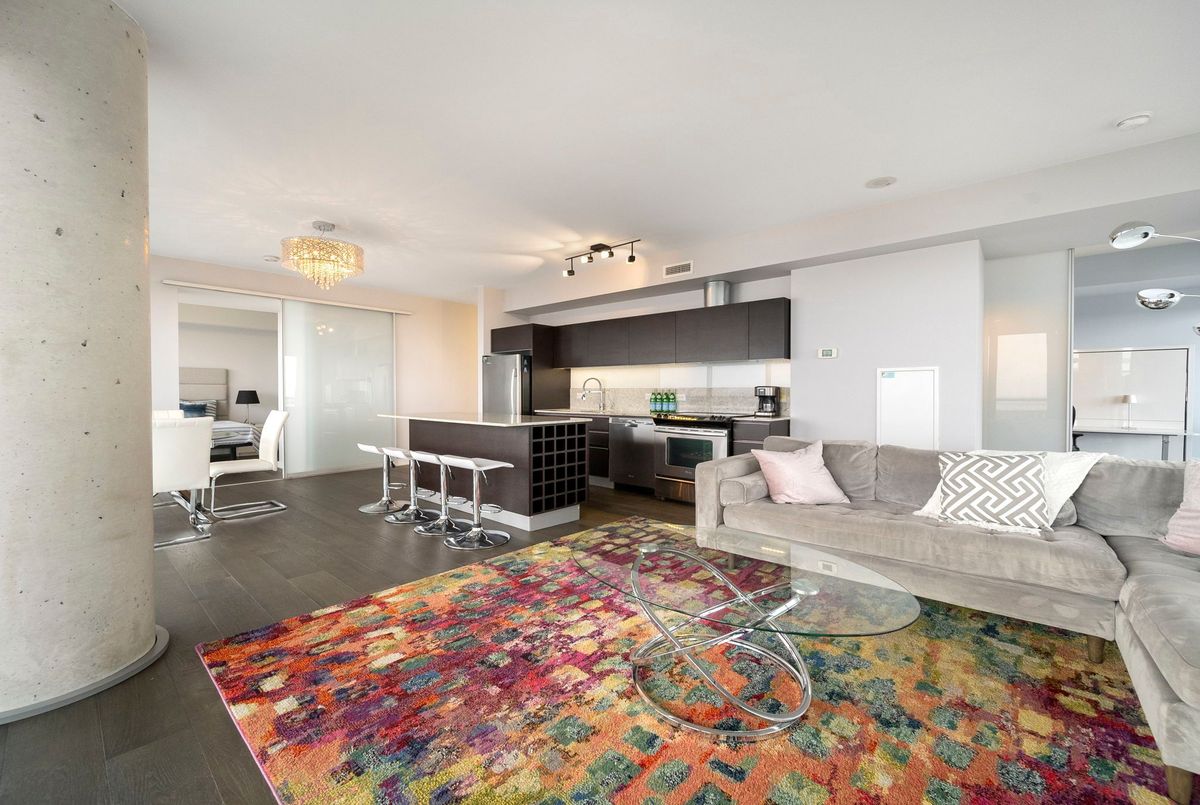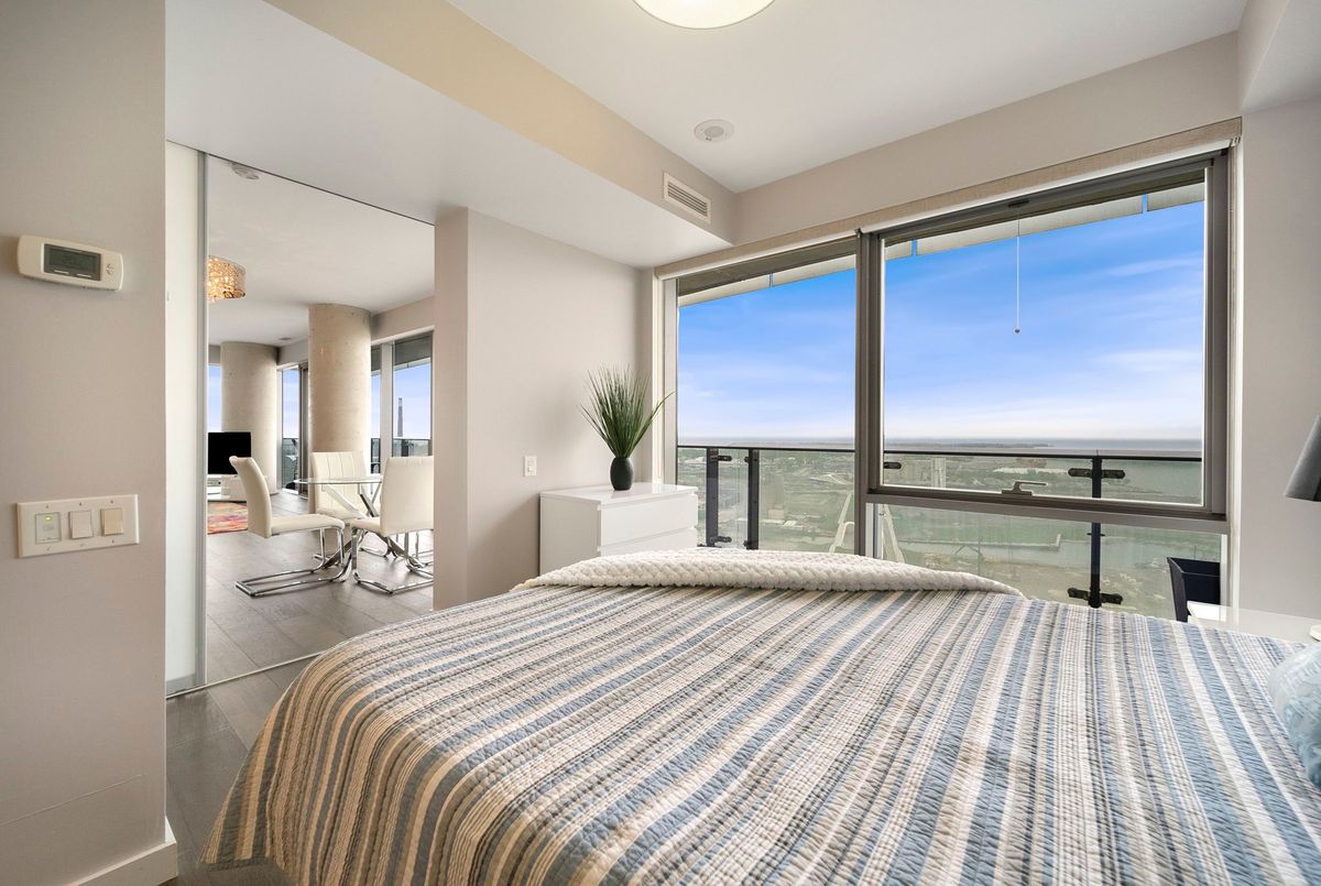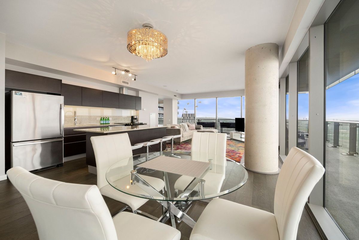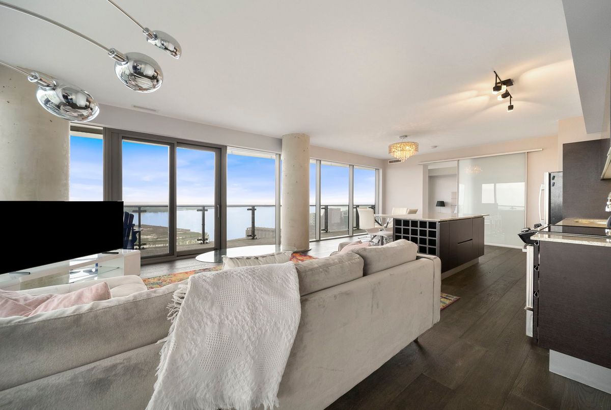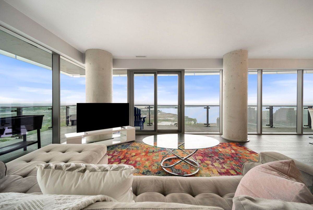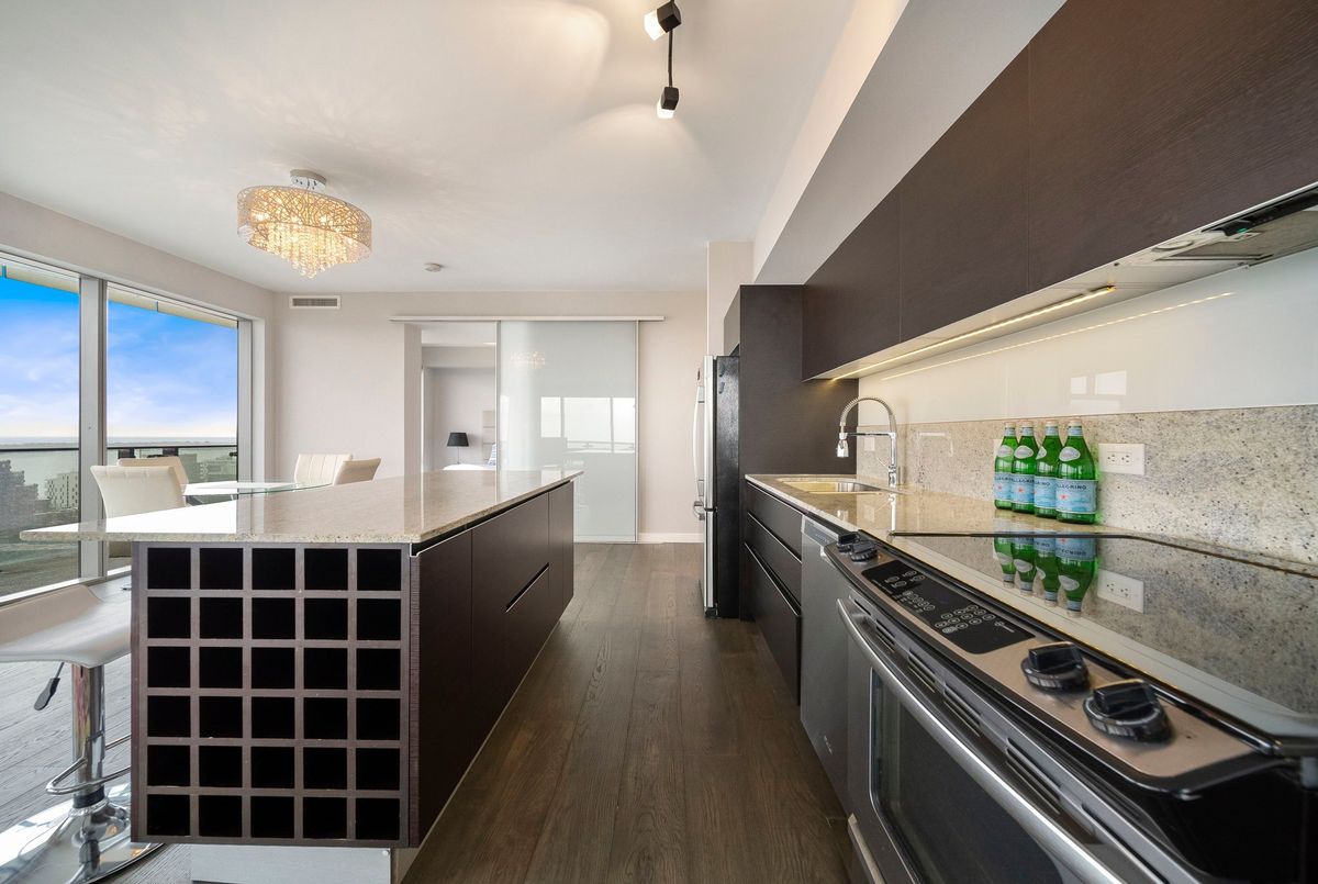 Stunning 2 Bed, 2 Bath furnished corner unit with breathtaking Lake & City views offering luxury living in the heart of the iconic Distillery District! This bright and spacious suite offers gorgeous unobstructed views of Lake Ontario, the city skyline, parks, and beaches all from your approx. 375 sq. ft. wraparound balcony! Thoughtfully designed with a split bedroom layout, this home features a primary bedroom with a walk-in closet and a luxurious 5 piece ensuite bath. The second bedroom includes a built-in Murphy bed, perfect for guests or maximizing your work-from-home space. The modern open concept kitchen is anchored by a custom island, and the suite includes full sized in-suite laundry, parking spot with EV Charger, and a separate storage locker! Building amenities are seemingly endless consisting of a rooftop terrace with a BBQ area, outdoor pool, party room, yoga area + exercise room, sauna, steam room, 24-hour concierge and more! Just steps to the Distillery Districts vibrant shops, dining, and events, with easy access to transit, trails, and the waterfront!