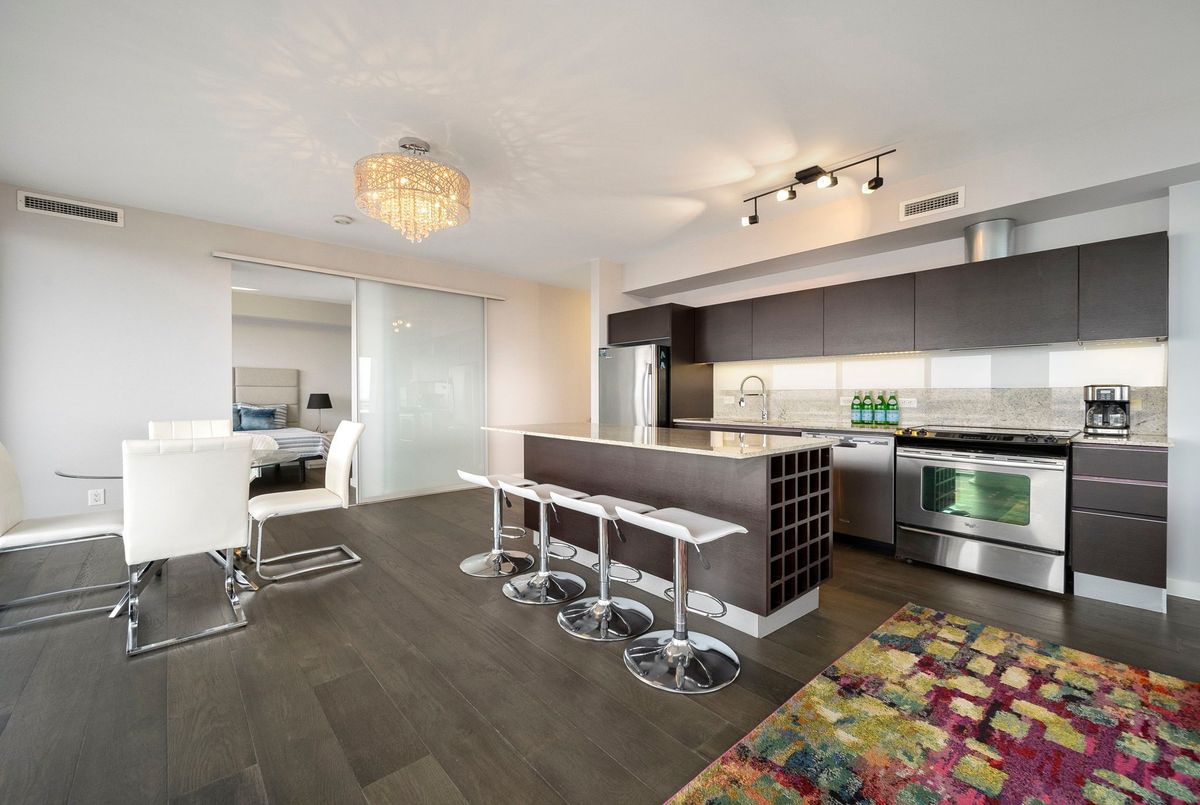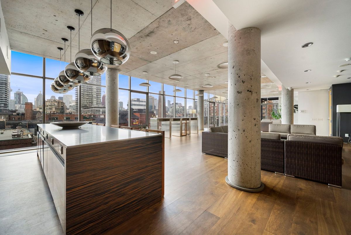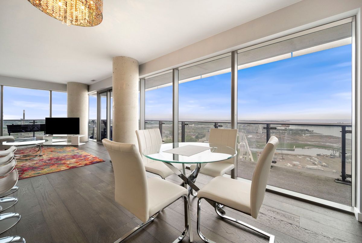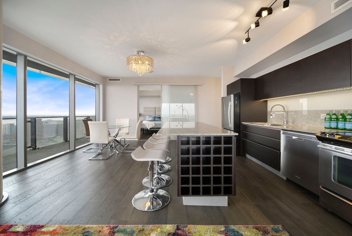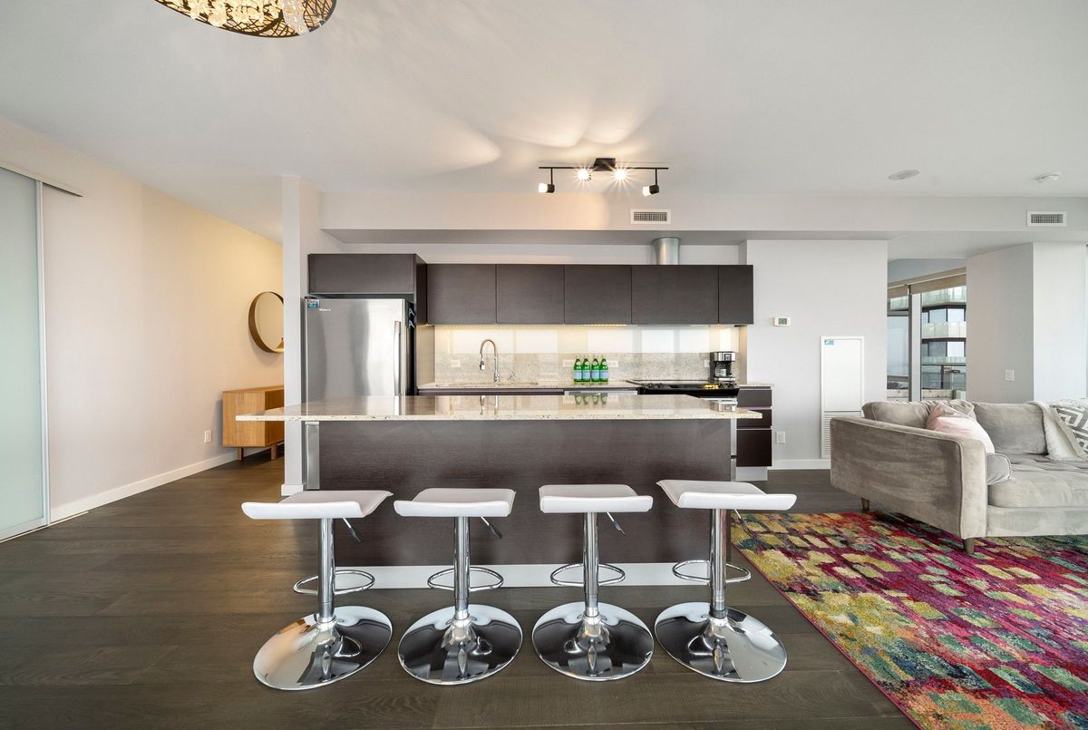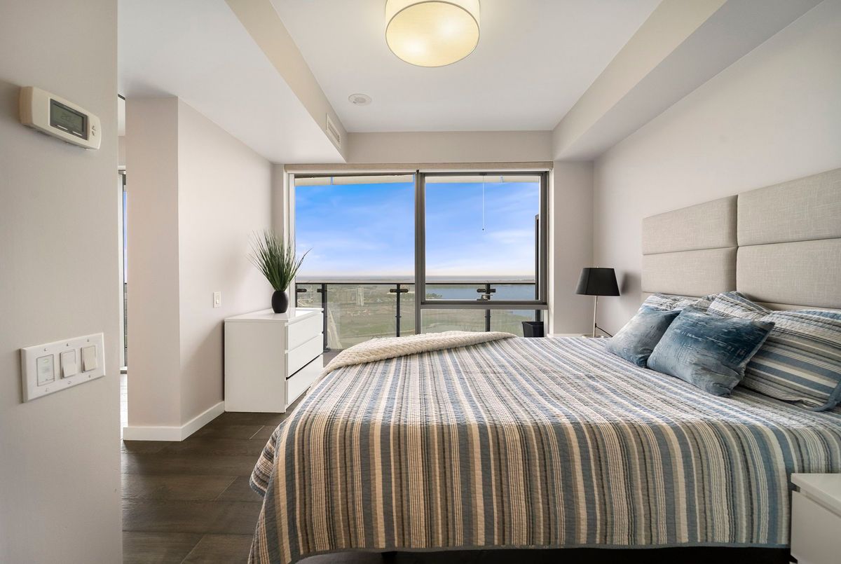 Stunning 2 Bed, 2 Bath furnished corner unit with breathtaking Lake & City views offering luxury living in the heart of the iconic Distillery District! This bright and spacious suite offers gorgeous unobstructed views of Lake Ontario, the city skyline, parks, and beaches all from your approx. 375 sq. ft. wraparound balcony! Thoughtfully designed with a split bedroom layout, this home features a primary bedroom with a walk-in closet and a luxurious 5 piece ensuite bath. The second bedroom includes a built-in Murphy bed, perfect for guests or maximizing your work-from-home space. The modern open concept kitchen is anchored by a custom island, and the suite includes full sized in-suite laundry, parking spot with EV Charger, and a separate storage locker! Building amenities are seemingly endless consisting of a rooftop terrace with a BBQ area, outdoor pool, party room, yoga area + exercise room, sauna, steam room, 24-hour concierge and more! Just steps to the Distillery Districts vibrant shops, dining, and events, with easy access to transit, trails, and the waterfront!