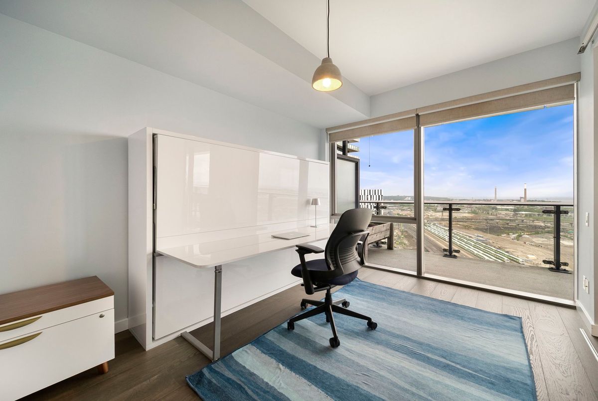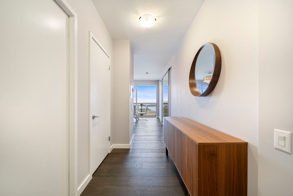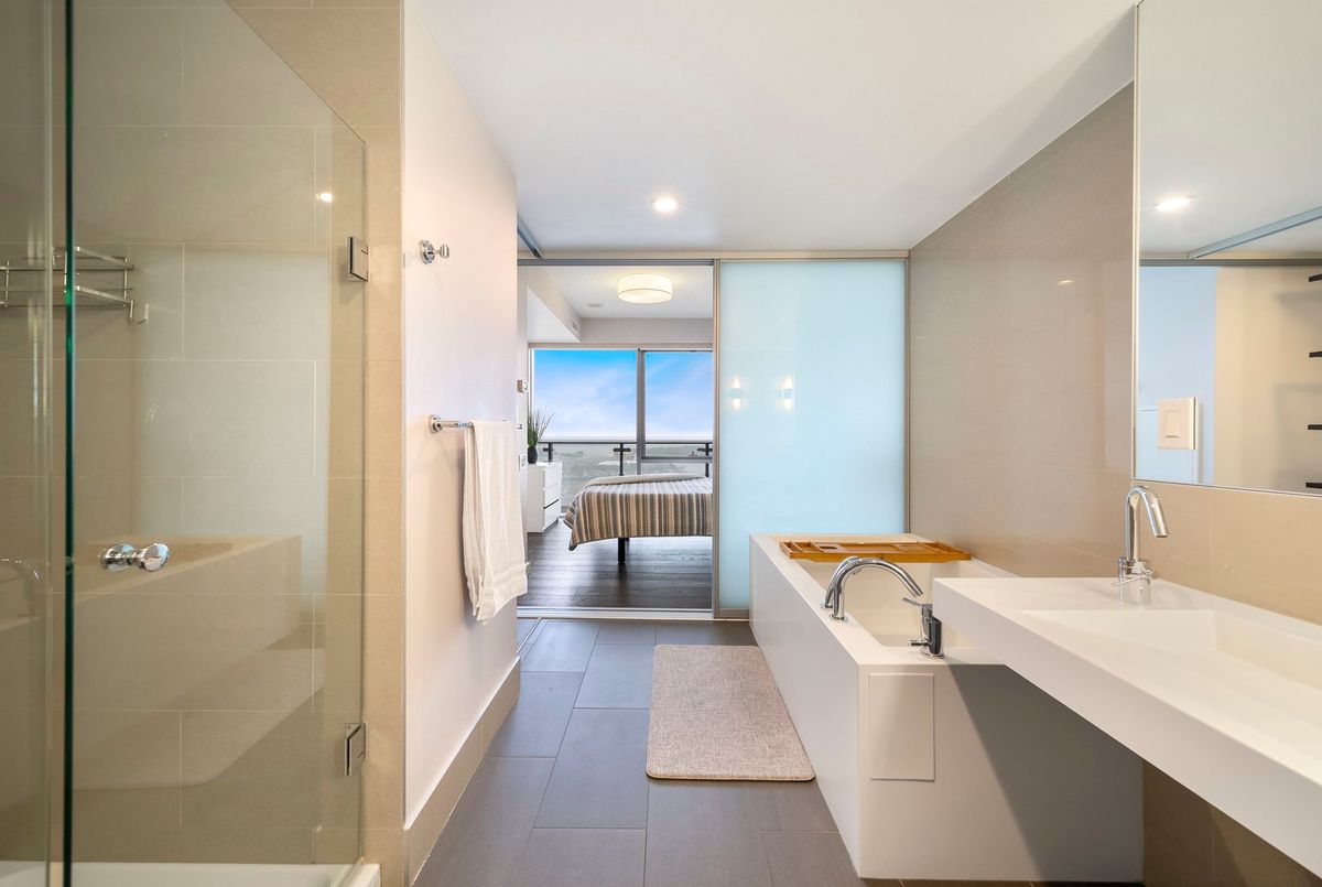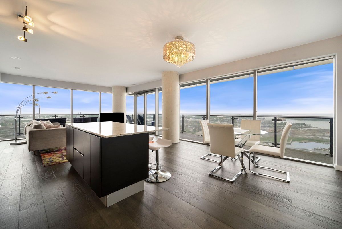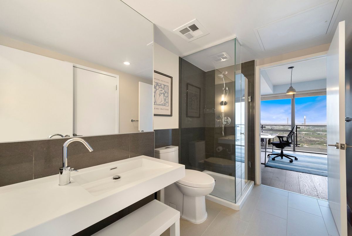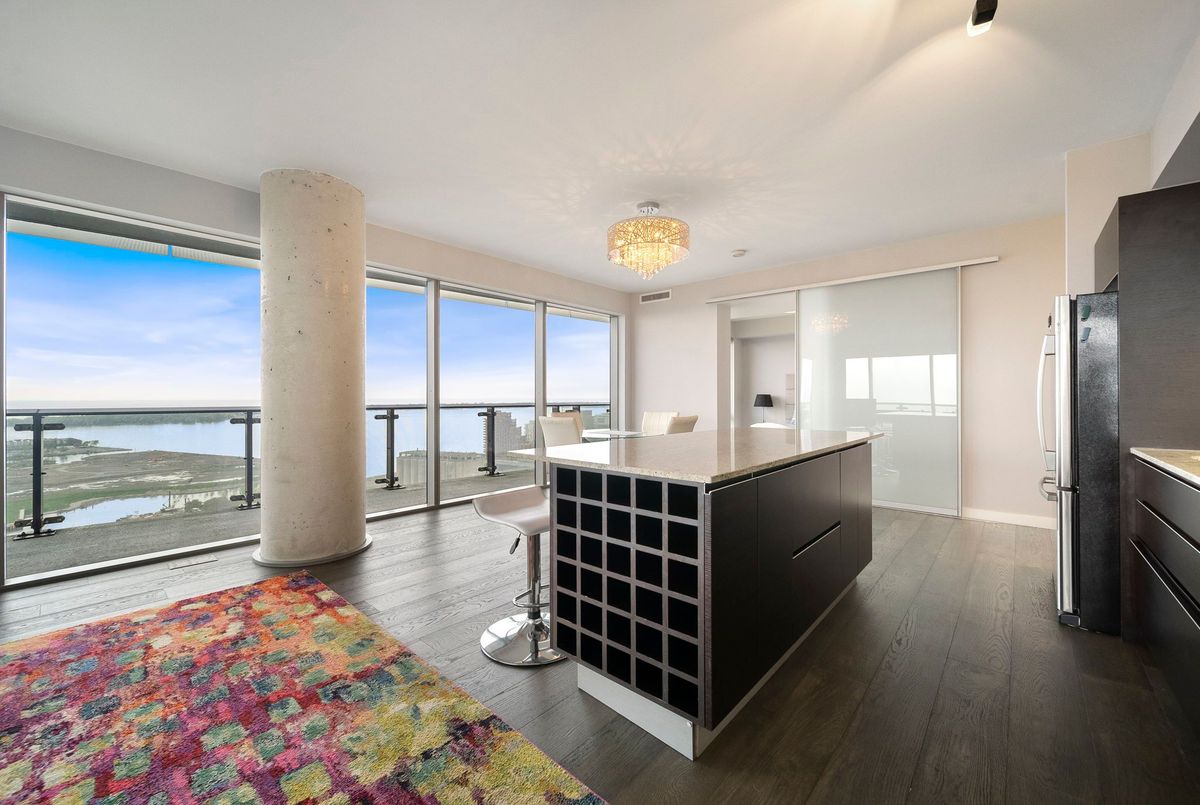 Stunning 2 Bed, 2 Bath furnished corner unit with breathtaking Lake & City views offering luxury living in the heart of the iconic Distillery District! This bright and spacious suite offers gorgeous unobstructed views of Lake Ontario, the city skyline, parks, and beaches all from your approx. 375 sq. ft. wraparound balcony! Thoughtfully designed with a split bedroom layout, this home features a primary bedroom with a walk-in closet and a luxurious 5 piece ensuite bath. The second bedroom includes a built-in Murphy bed, perfect for guests or maximizing your work-from-home space. The modern open concept kitchen is anchored by a custom island, and the suite includes full sized in-suite laundry, parking spot with EV Charger, and a separate storage locker! Building amenities are seemingly endless consisting of a rooftop terrace with a BBQ area, outdoor pool, party room, yoga area + exercise room, sauna, steam room, 24-hour concierge and more! Just steps to the Distillery Districts vibrant shops, dining, and events, with easy access to transit, trails, and the waterfront!