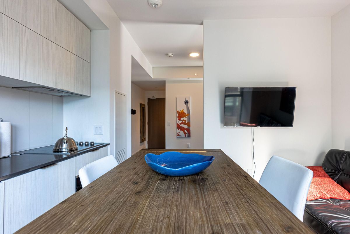 Fully Furnished Daniels Lighthouse Tower East - Alumni Collection Experience upscale living in this upgraded Junior 1-bedroom suite (The Humber Model), featuring a double European bed frame. This stylish unit includes a locker, roller blinds, a wall-mounted T.V., an island bar with two stools, plus dishes, utensils, decorative pictures, and a mirror. Enjoy stunning south-facing views and close proximity to Sugar Beach and St.
