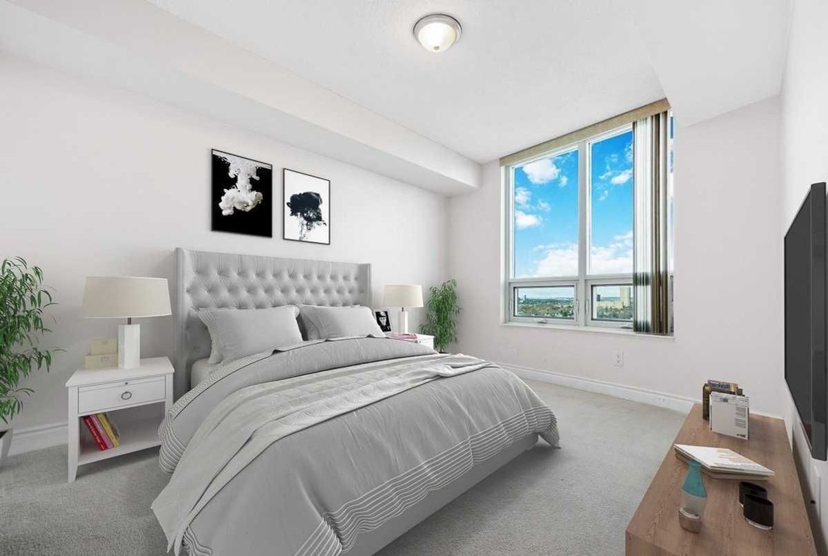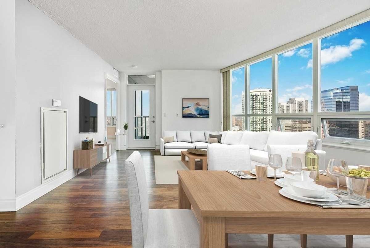 Welcome to this extra-large, beautifully appointed north-east corner unit in the prestigious Meridian Tridel Towers at Yonge & Finch. Ideally located just steps from the subway, grocery stores, city centre amenities, Highway 401, and top-ranked schools. This bright and spacious 917 sq.ft. layout features engineered hardwood flooring throughout and expansive windows offering unobstructed panoramic views. The open-concept living and dining area is perfect for both everyday living and entertaining, complemented by a private balcony. Residents enjoy access to premium resort-style amenities, including an indoor pool, hot tub and sauna, fully equipped fitness centre, golf practice range, guest suites, elegant lounge, library, and billiards room. An exceptional opportunity to live in one of North York's most sought-after communities. Please note that the listing photos are from a previous listing. The kitchen and bathrooms were upgraded in 2021.