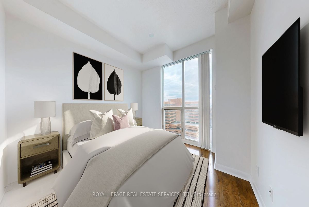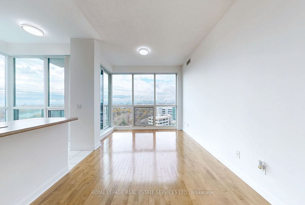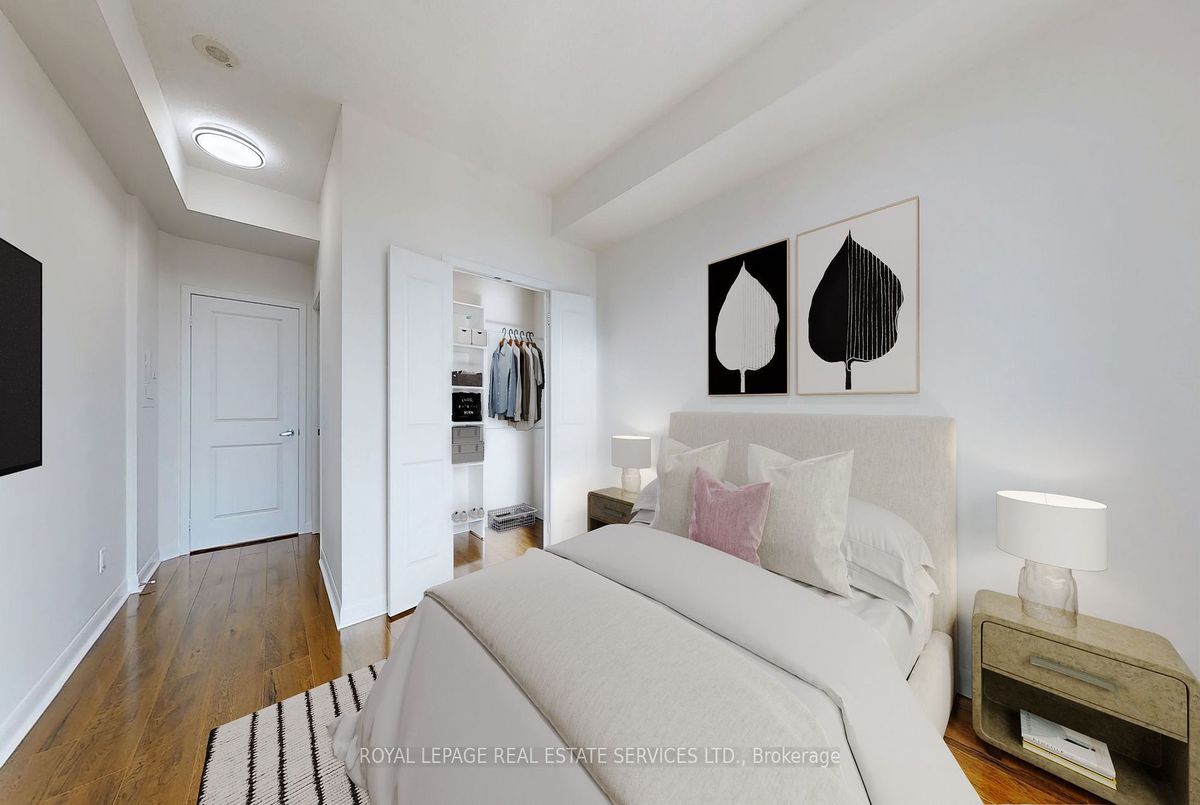 Renovated Oct-Nov/24 This Corner is a Split Plan 2 bedroom with 2 four piece bathrooms and is just under 900 sq ft.It features a rare 9 ft (2.80 m) ceiling height.Located in the Luxury One Sherway Tower 2 condo building across the road from Sherway Gardens Mall.The unit overlooks Lake Ontario, Etobicoke Creek and serene Green Space.It is Immaculately Clean, Bright and Spacious.The floor Plan has an Open Concept Living, Dining Kitchen/Breakfast.Floor to Ceiling Windows provide abundant Natural Light. Interior Features include:Luxurious Hardwood Flooring in the Living and Dining Rooms plus newly Installed Quality Laminate in the Bedrooms that meet the condo's soundproofing rules.The Landlords Installed Additional Underlay under the laminate as well as new lighting and light switches throughout.You will be delighted to have a Primary Bedroom large enough for space for a King Sized Bedroom Set and an envious walk-in closet with custom built closet organizer plus a 4 piece ensuite bathroom.The LG Stainless Steel Kitchen appliances are 1 year's old. The laundry closet has secured shelving and modern double bi-fold doors. Conveniently located on level P2 Tower 2 is 1 parking spot and the Locker is in Tower 1 on P3. Great amenities are located on the 3rd floor of the building: Indoor pool, whirlpool, sauna, Fitness Gym and Virtual Golf. The main floor has a Party/Multimedia Room, Lounge, Library and Parcel Pick-Up Lockers. Peace -of- mind 24 hours Concierge/Security and Underground Visitors Parking.Truly an incredible and desired condominium building conveniently located with easy access to The QEW, Hwy 427, The Gardiner Expressway within minutes drive. You can walk across the road to CF's Sherway Gardens Mall to shop or eat.Just steps away from the front of the Condo building are TTC buses taking approximately 15 minutes to the Kipling Station, 23 mins to the Royal York Station or 13 mins to the Long Branch Go Train Station.(Photos with Furniture were Virtually Staged)